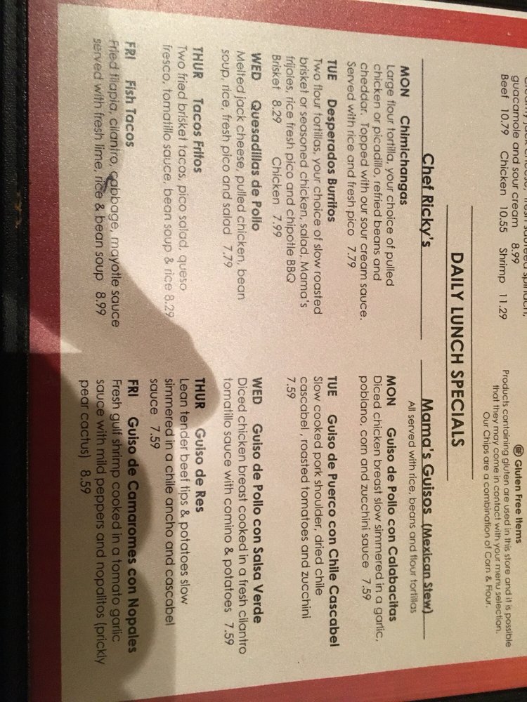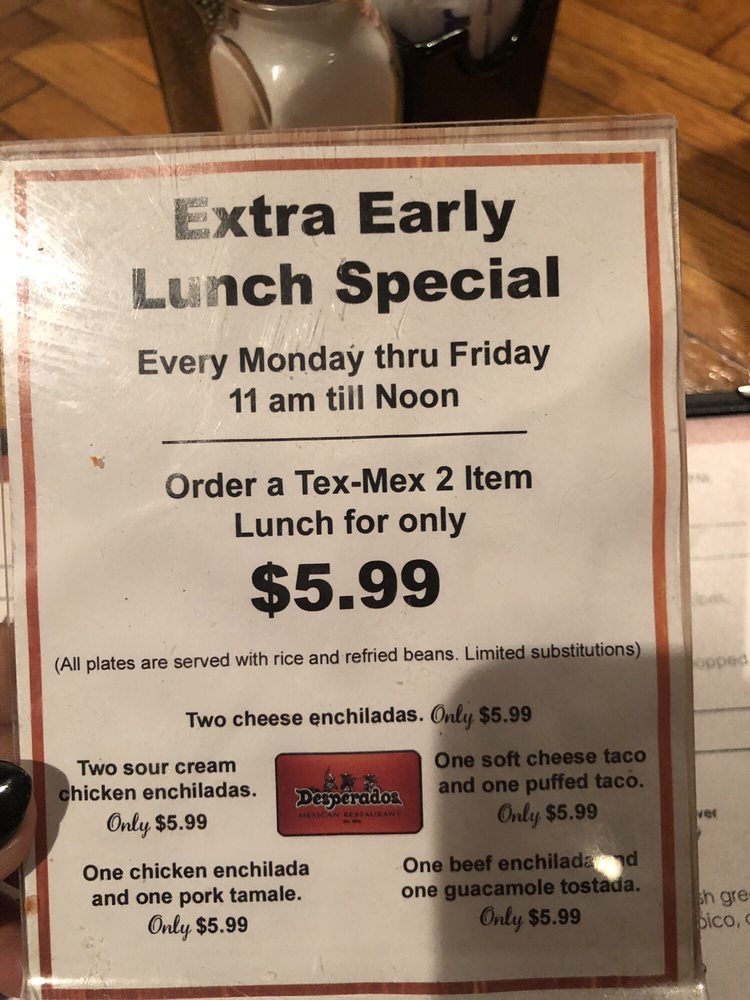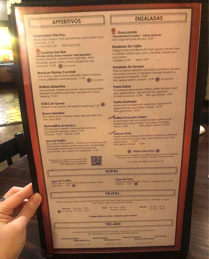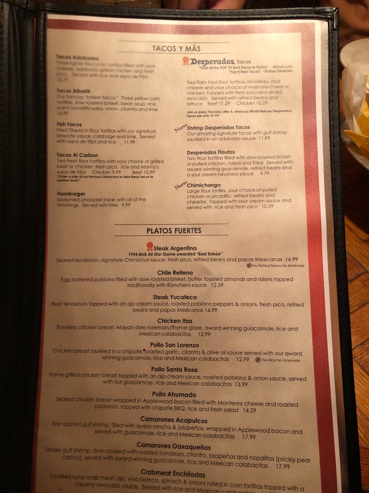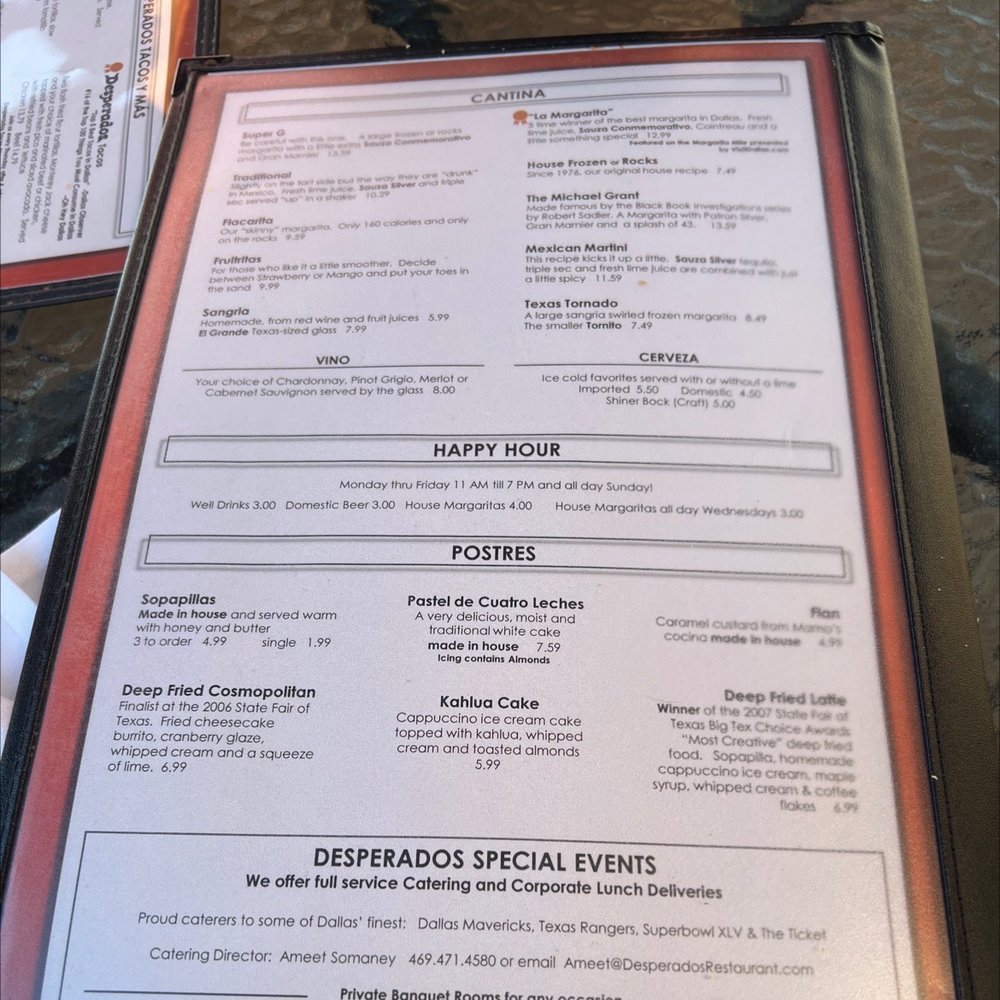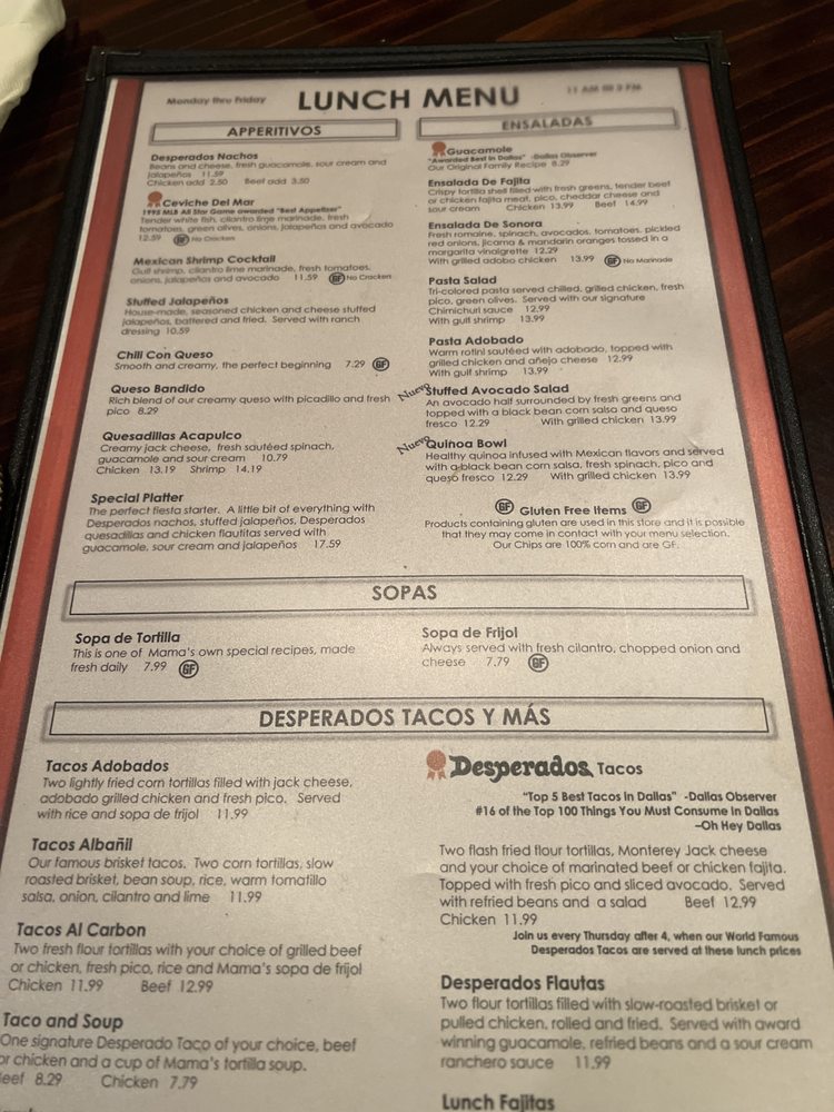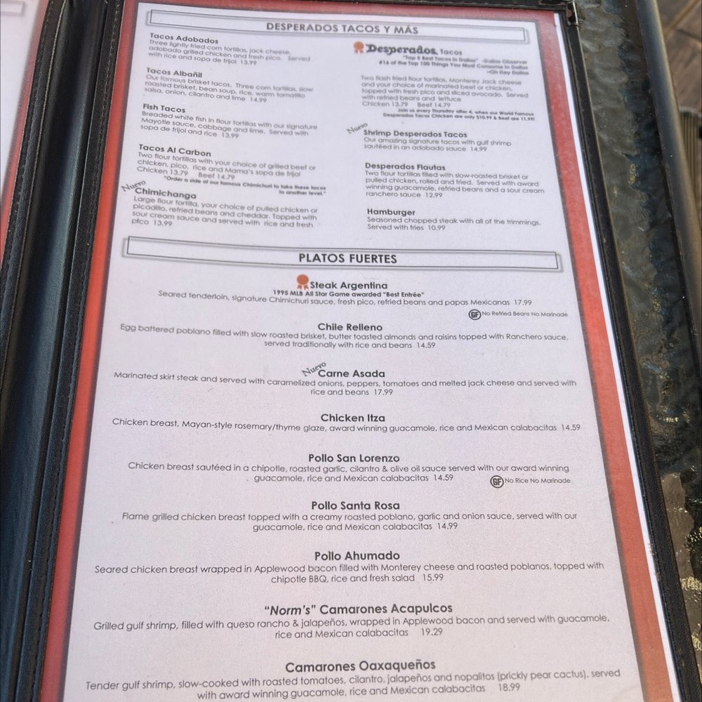 Introducing the menu at Desperados Mexican Restaurant, located in Dallas, TX, where Tex-Mex flavors shine. From appetizers like Desperados Nachos to the flavorful Ceviche Del Mar, the menu is a celebration of Mexican cuisine. Savor soups like Sopa de Tortilla and Sopa de Frijol, showcasing Mama's special recipes. Enjoy fresh salads like Guacamole and Ensalada de Sonora. Customer reviews rave about the tasty Tacos al Carbon and delicious fajitas. The atmosphere is inviting, with prompt service and a welcoming owner who ensures all patrons are satisfied. Whether you're craving traditional Mexican dishes or Tex-Mex favorites, Desperados Mexican Restaurant is a must-visit destination.